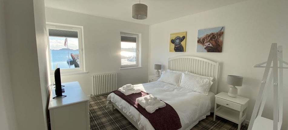 Looking over toward Lews Castle Grounds, Fitted with Double bed (UK size) complete with Egyptian Cotton Linen and a smart TV.